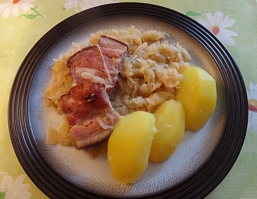 Geräucherter Bauchspeck, Sauerkraut, Kartoffeln