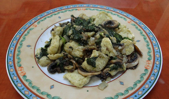 Blattspinat und Nocken 4 bis 5 Minuten mitbraten,
