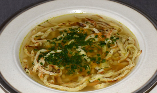 In die servierte Suppe die Frittaten geben und mit Schnittlauch bestreuen.