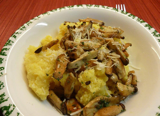 Polenta auf dem Teller anrichten und die Pilze obenauf geben.