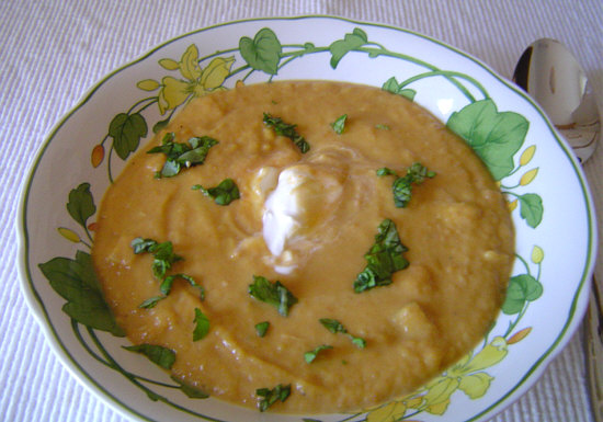 Schlagsahne dazu geben (Menge richtet sich nach der Konsistenz der Suppe) und
