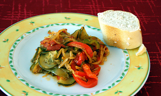 Zwiebel-Paprika-Gemüse, Petersilienkartoffeln, Salat - Schoko-Roulade