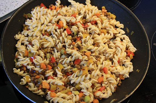 einige Minuten dünsten lassen, Biolinsen aus der Dose dazu, gekochte Spiralen