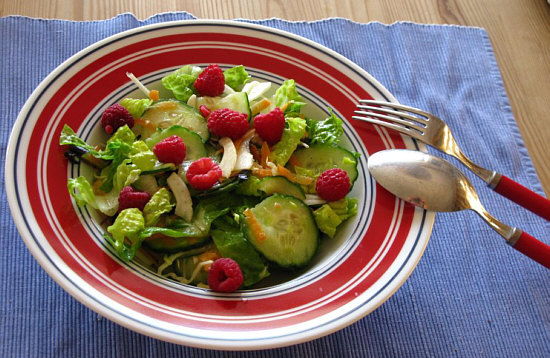 gemischter Salat, Joghurt mit Himbeeren