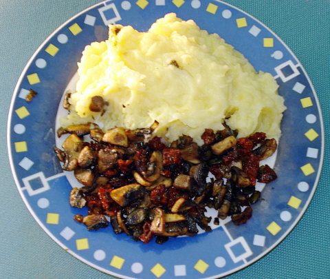 Kartoffelpüree mit Champignons, Tomaten und Pesto