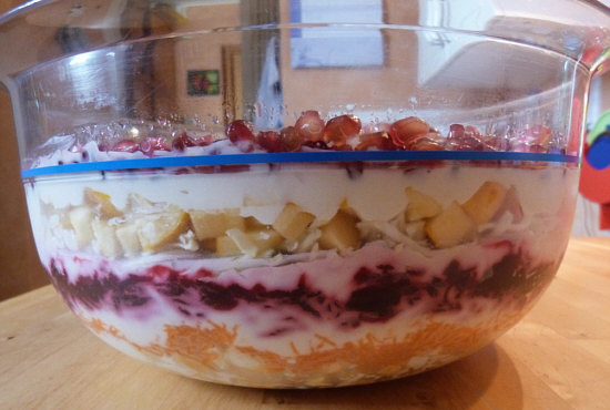 nicht so dick, nur bedeckt auf die rote Bete geben und wieder eine dünne Schicht