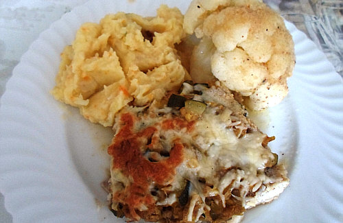 Zwiebel-Paprika-Gemüse, Petersilienkartoffeln, Salat - Schoko-Roulade