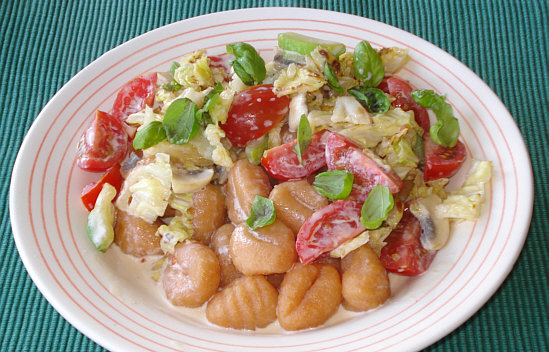 Die Gemüsesauce zu den abgetropften Gnocchi geben.