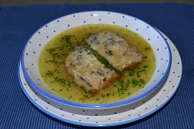 Suppe anrichten - mit Schnittlauch bestreuen und Brotscheiben einlegen.