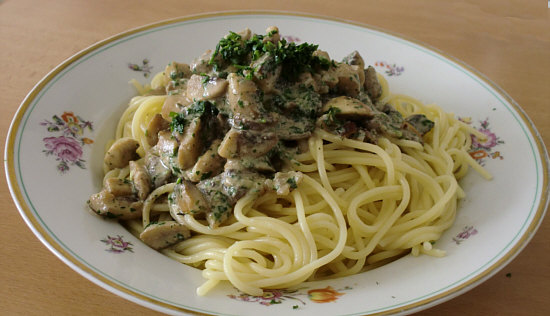 Öl in die Pfanne und die Champignons scharf anbraten, Hitze reduzieren,