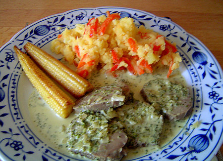 Schweinefilet mit Petersiliensoße, Paprika-Kartoffel-Stampf und Maiskölbchen