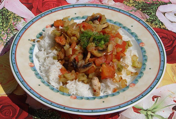 Zwiebel-Paprika-Gemüse, Petersilienkartoffeln, Salat - Schoko-Roulade
