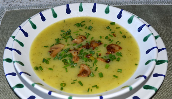 Die Suppe anrichten - mit den Champignons und Schnittlauch bestreuen.