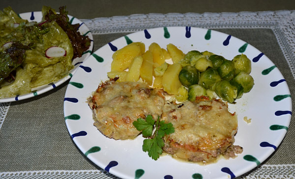 Hackfleisch, mit Käse überbacken, Kartoffeln, Rosenkohl