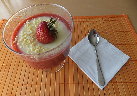 Spaghetti mit Spargel und Putenschinken, Vanillepudding im Erdbeerspiegel