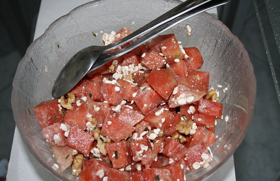Alles zusammen zu den Melonenstücken in die Schüssel geben und vermischen.