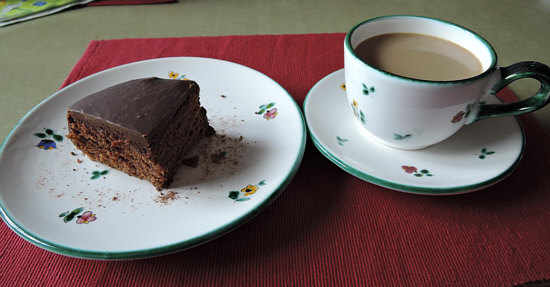 Backerbsensuppe - Putenfleisch mit Pfifferlingsauce, Salat - Sachertorte