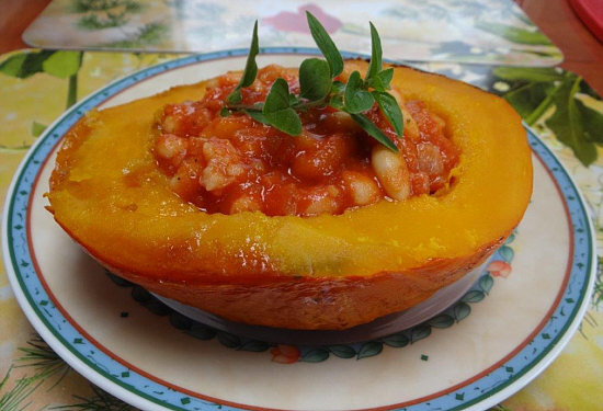 Die Kürbishälften aus dem Ofen nehmen, mit dem Gemüse füllen und sofort