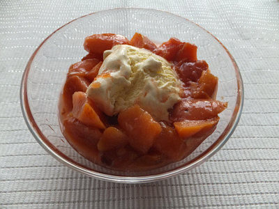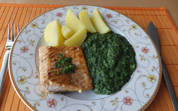 Lachs, Rahmspinat, Kartoffeln - Gedämpfte Nektarinen mit Vanilleeis