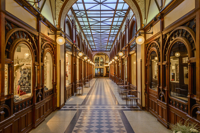 Erbaut wurden die Passagen mit den dunklen, reich verzierten Holzvertäfelungen