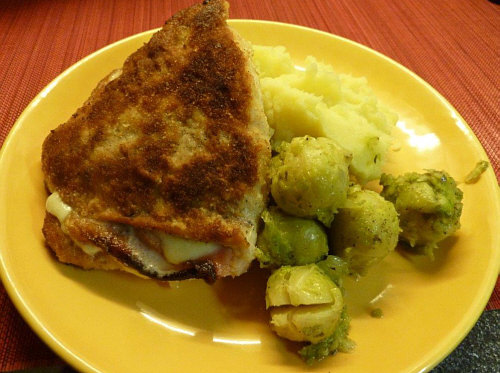 Cordon bleu, Kartoffelpüree, Rosenkohl