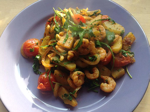 Garnelen zu den Kartoffeln geben und erwärmen.