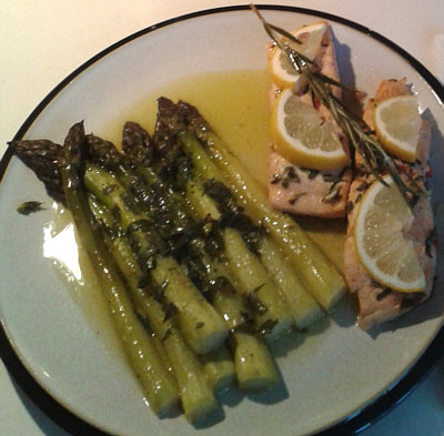 Spargel aus dem Ofen und marinierte Lachsfilets