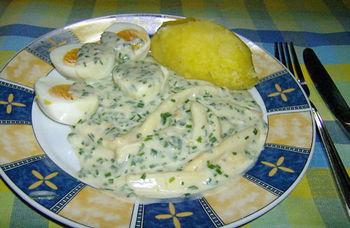 und dann die heiße Soße, diesmal mit Spargelspitzen, dazu gegeben.