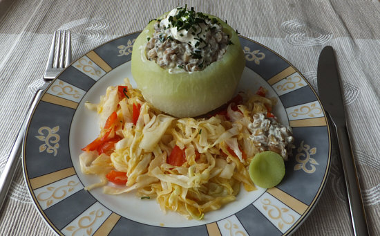 Kohlrabi schälen, mit einem Löffel oder Kugelausstecher aushöhlen und zum