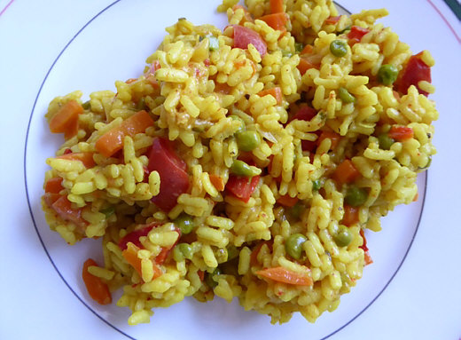 Paella-Reis dazugeben und ca. 1 Min. mitdünsten.