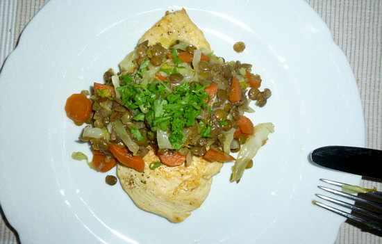 Hähnchenbrust-Schnitzel mit warmen Gemüse-Linsen