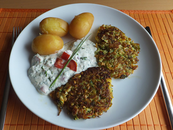 Weizen-Zucchini-Frikadellen, Schnittlauchsoße, Kartoffeln
