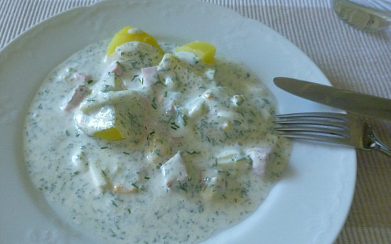 Salzkartoffeln etwas erkalten lassen ... Kräuterquark über die Kartoffeln.