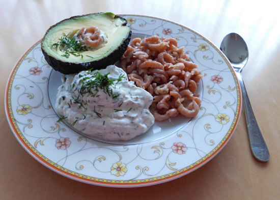 Den Dip zusammen mit frischen Krabben aus der Avocado zusammen auslöffeln.
