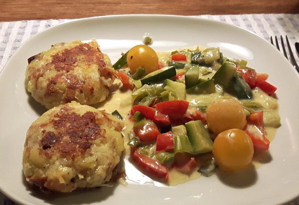 Brezelpuffer, gemischtes Gemüse, Rahmsoße