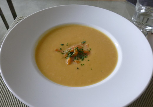 Weich kochen, sehr fein pürieren, falls die Suppe zu dick ist, Brühe nachgießen,