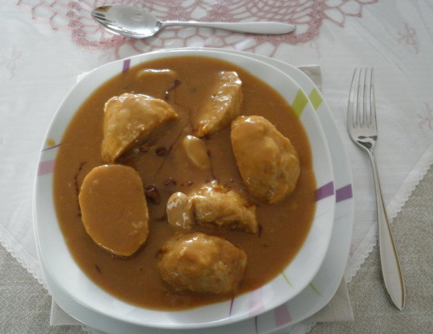 Die fertigen Knödel aus dem Wasser nehmen, 2 oder mehr Knödel in einen Teller,