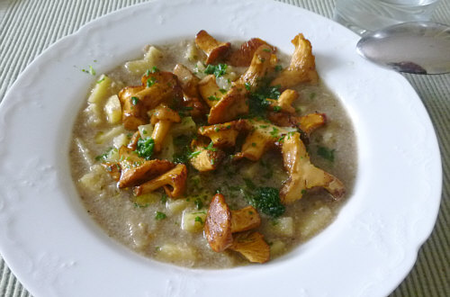 Die angebratenen Pfifferlinge über das Kartoffelgulasch geben, mit Petersilie