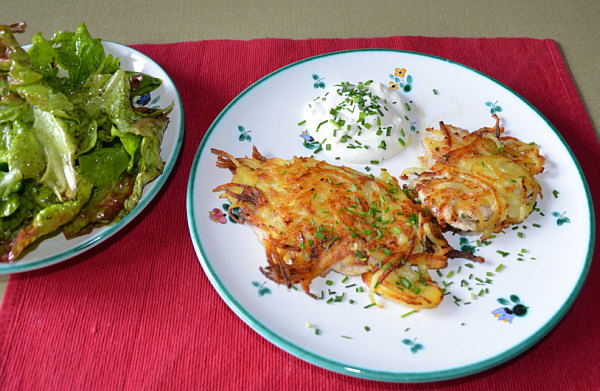 Reibeplätzchen mit Räucherlachs und Feldsalat
