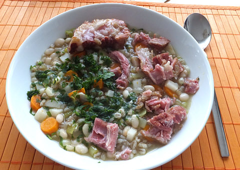 (Graupen-Bohnen-Eintopf mit Pökelfleisch)