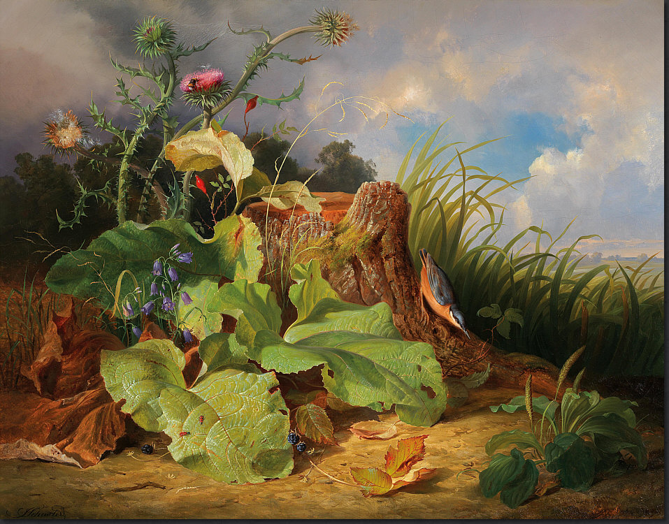 "Stillleben mit Disteln, Glockenblumen, Hagebutten und einem Kleiber" ... gemalt
