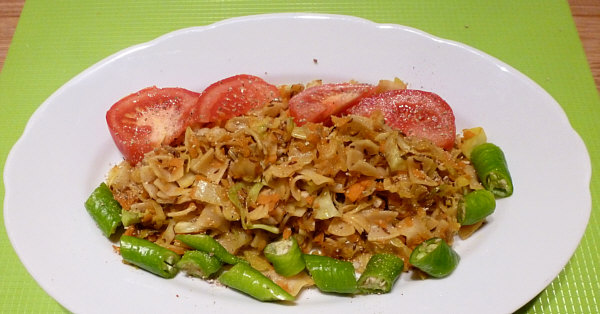 dann den geschnittenen Kohl dazu, anbraten und bissfest schmoren lassen.