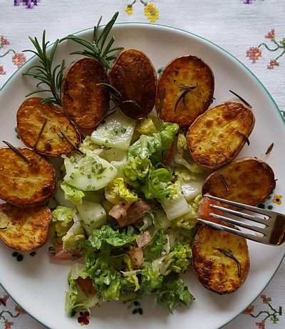 Olivenöl und etwas grobes Salz, Rosmarin-Zweigchen(Nadeln) dazu,