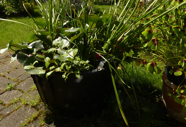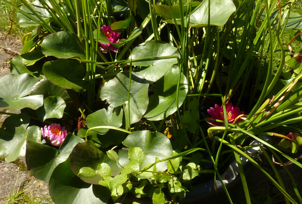 ... dort fühlen sie sich sichtbar wohl und die Mini-Seerose blüht sogar:
