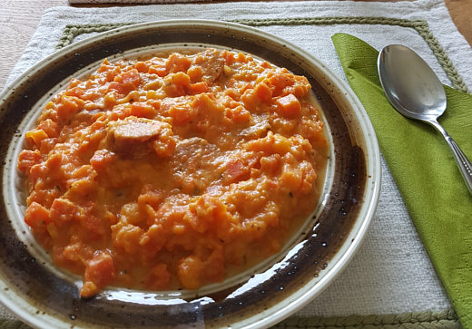 sie hat rote Kartoffel mit Möhrengemüse und als Beilage Mettwürste gekocht,