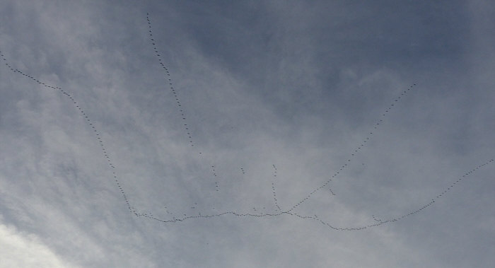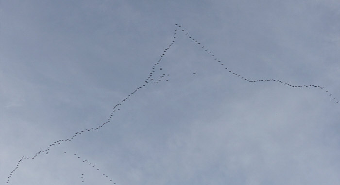 Da ja nicht jeder dort wohnt, wo die Kraniche drüber ziehen, hier mal drei Bilder, wie man sich das vorzustellen hat. Beate hört die Kraniche immer, bevor sie sie dann am Himmel entdeckt. [Kommentieren]