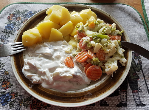 Zwiebel-Paprika-Gemüse, Petersilienkartoffeln, Salat - Schoko-Roulade