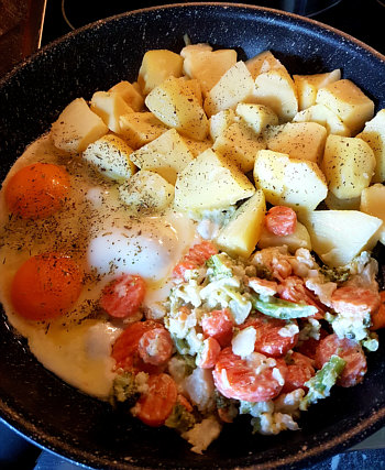 Rest-Kartoffel und Rest-Gemüse vom Vortag in die Pfanne,