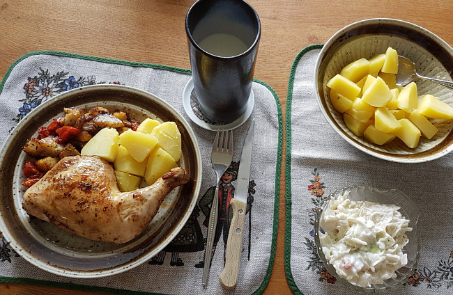 Goldenes Huhn mit Kartoffeln - Mandel-Tiramisu