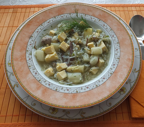 Suppe mit Spätzle - Gebackene Kartoffeln / Käse mit Schnittlauchrahm/Kartoffeln